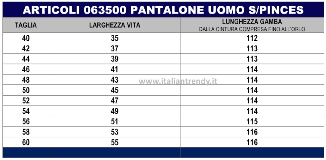 Le taglie disponibili per questo pantalone vanno dalla 42 alla 60, permettendo a tutti di trovare la misura perfetta per un’ottima vestibilità.
