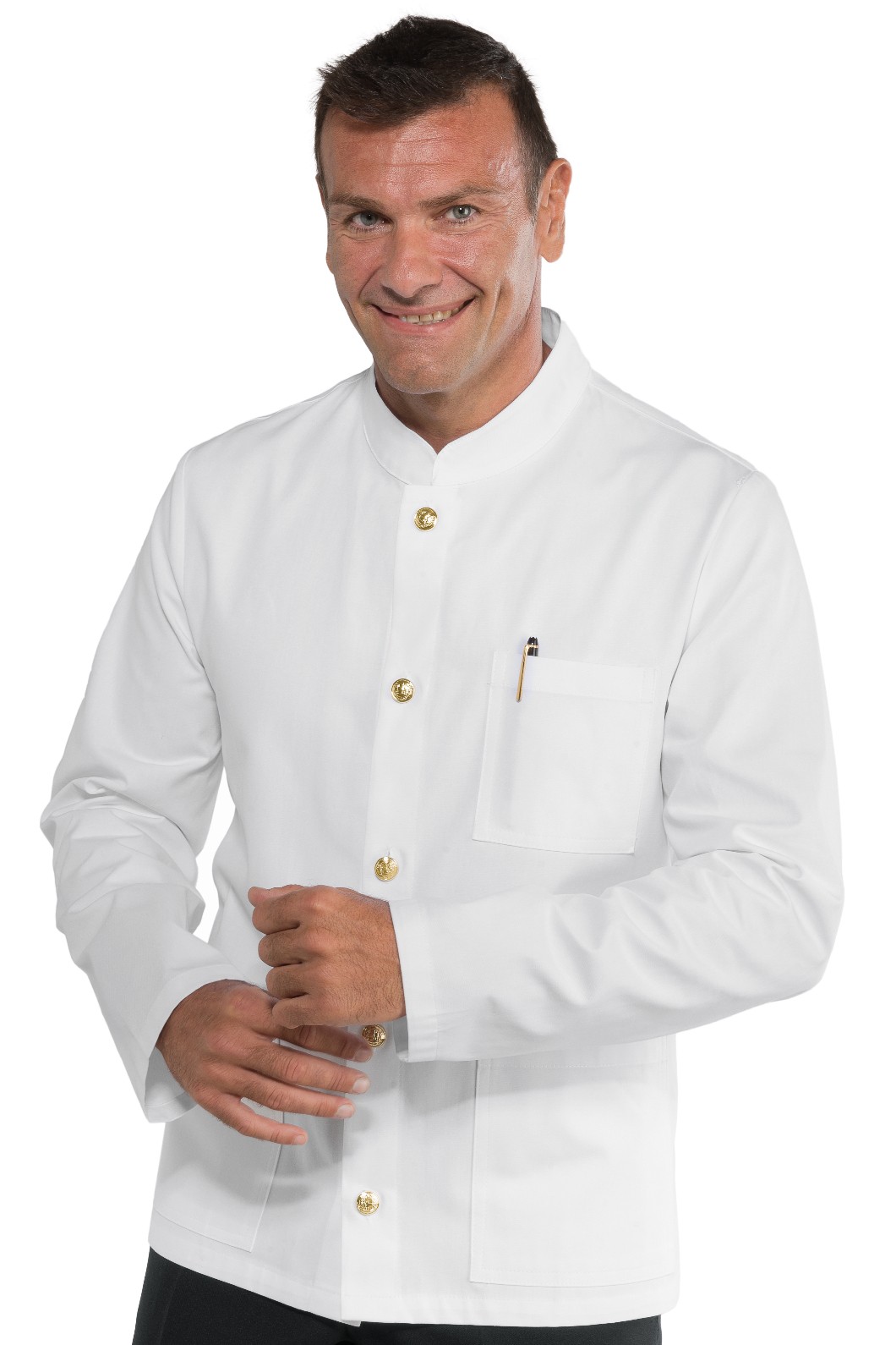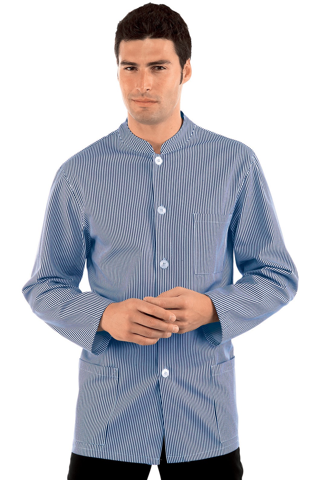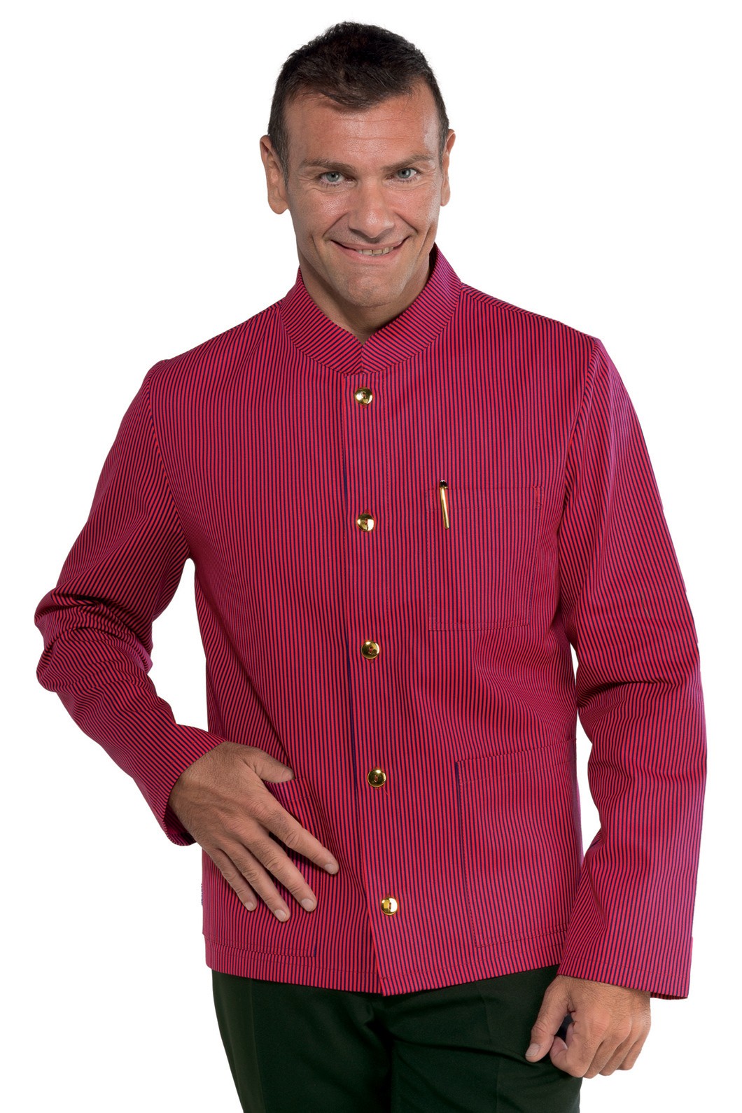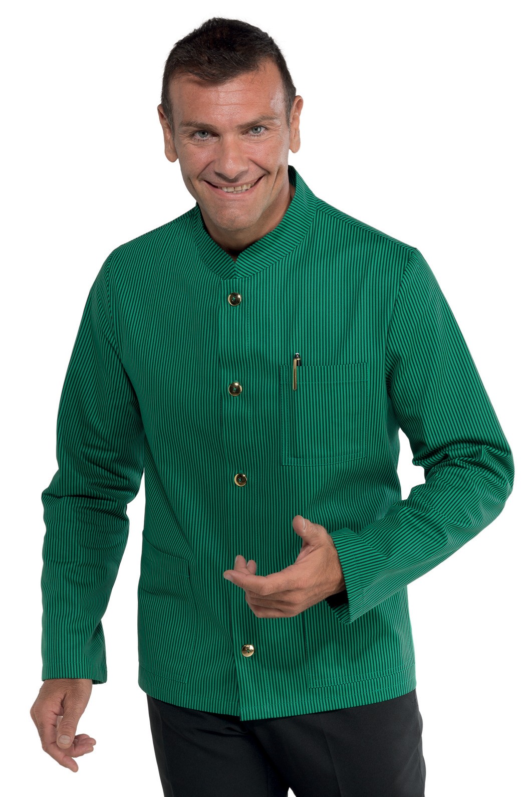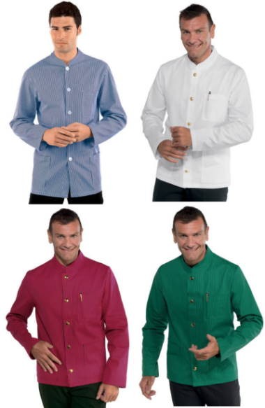 Giacca coreana uomo per Divisa Alberghi Ristoranti Hotel, in Puro Cotone Rigata e Tinta Unita 4 varianti di colore. bianca, verde rigata, rossa rigata, bianca rigata blu. Classica giacca coreana da Uomo per collaboratori alberghieri e domestici in cotone 100% con bottoni a contrasto. Ideale divisa per conferire un aspetto curato e professionale al personale. Brand: Isacco