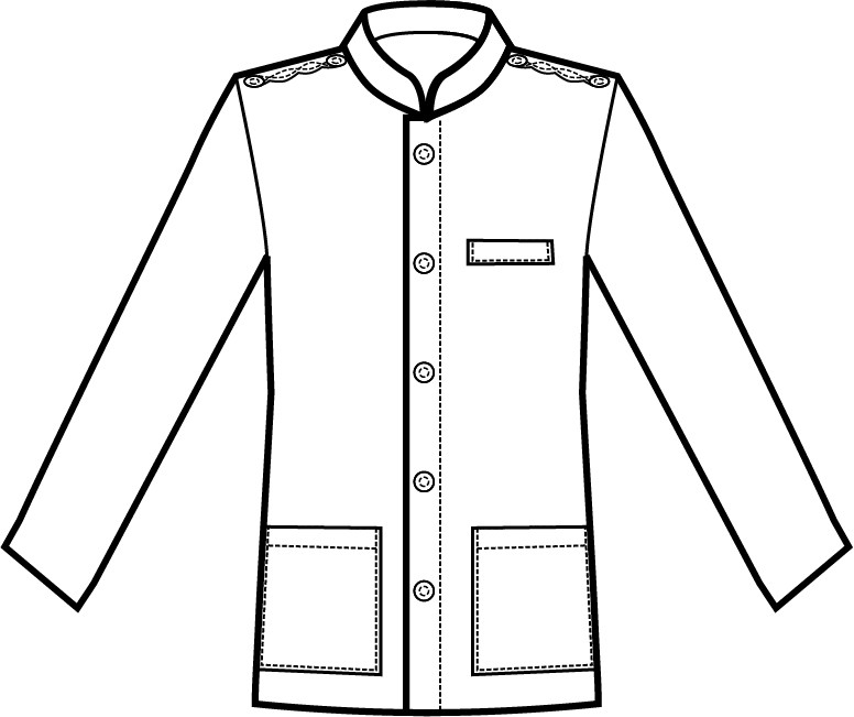 La giacca ha una linea classica ed elegante, proporzionata, la chiusura è centrale con collo alla coreana e con trecce sulle spalle e bottoni dorati, le tasche sono applicate.