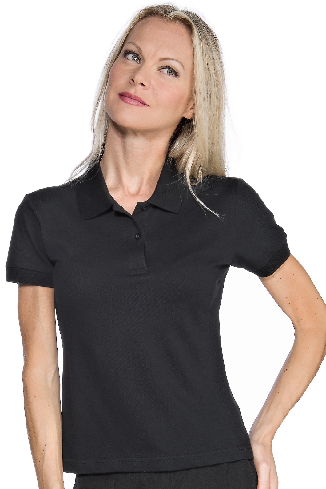 Polo donna in nero dalla linea giovane ed elegante, ben proporzionata che permette di indossarla anche fuori da pantaloni o gonne.
