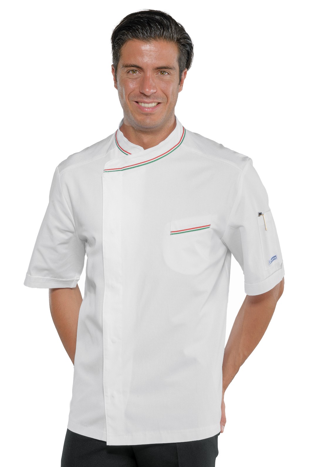 Classica e professionale giacca da cuoco per uomo in 100% cotone. Con profili tricolore che richiamano la bandiera italiana, per ricordare che in tavola il made in italy è sempre al top. Ottima per completare divise di pizzerie e ristoranti dove la tradizione della cucina italiana è più viva. Brand Isacco