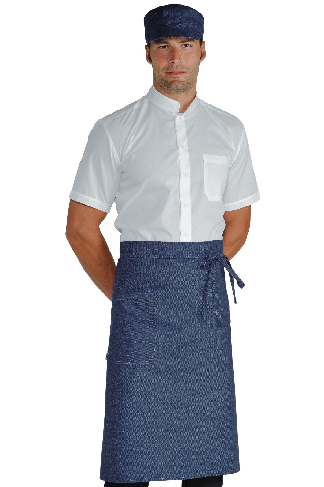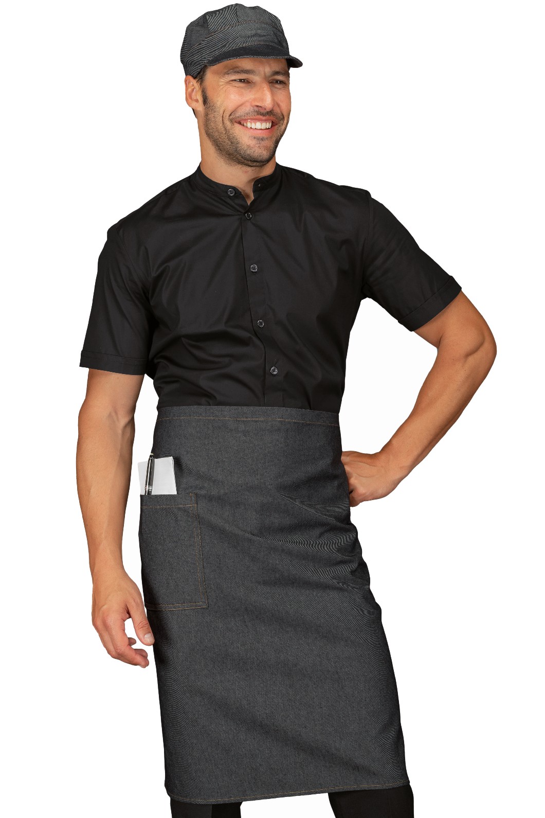 Grembiule al ginocchio disponibile in Blu Jeans o Black Jeans o anche in altri colori. Ottimo articolo per bar, pub, ristoranti, pizzerie, gelaterie, pasticcerie, ristorazione o per camerieri al servizio ai tavoli.