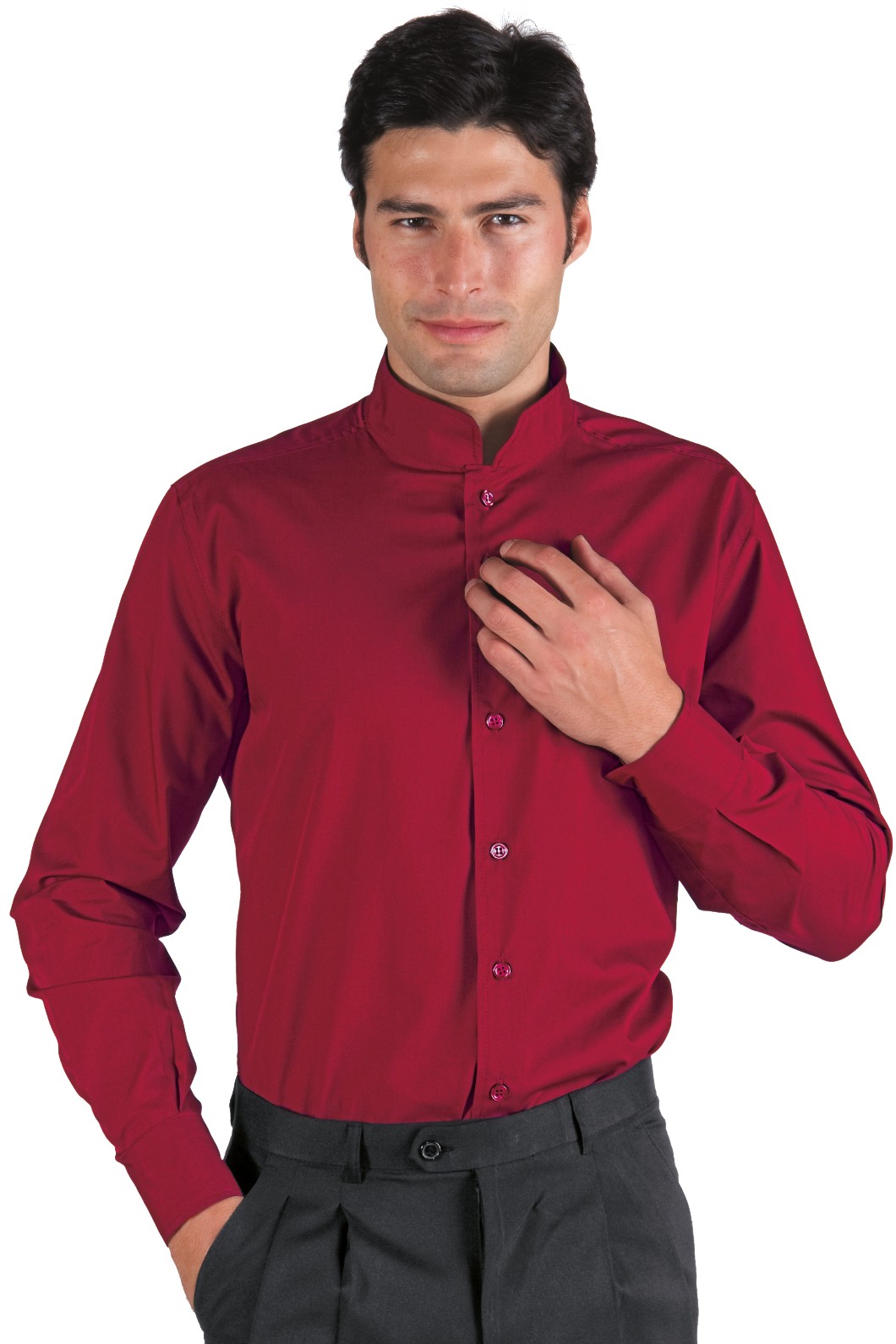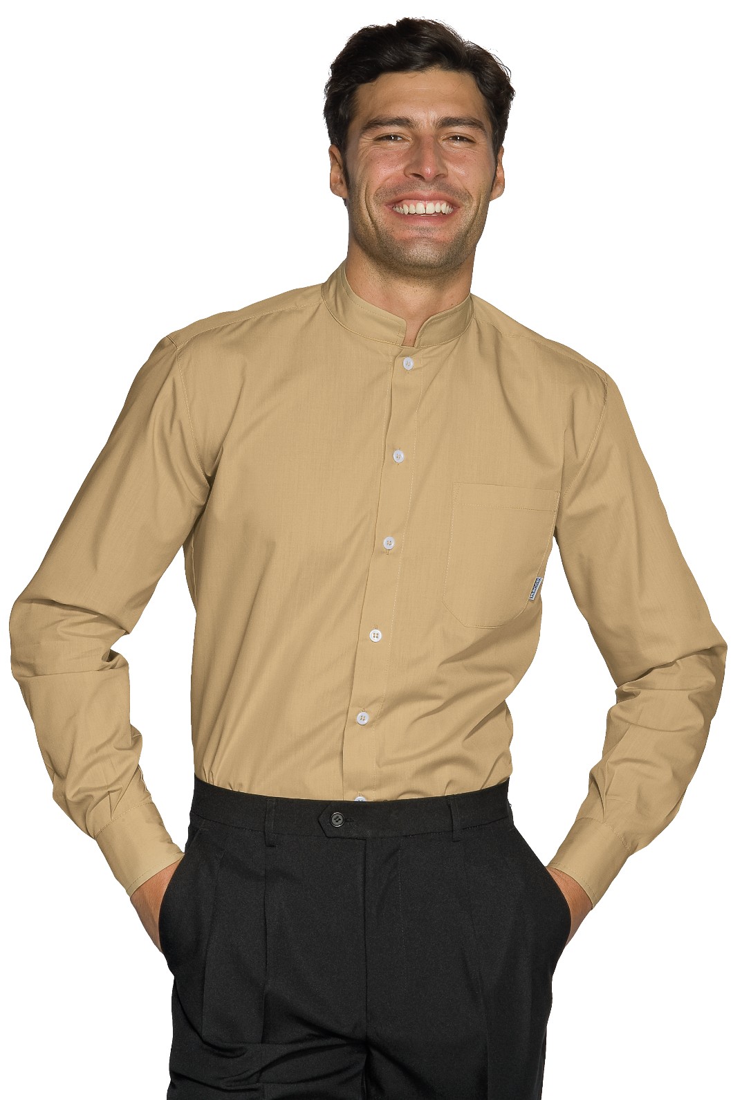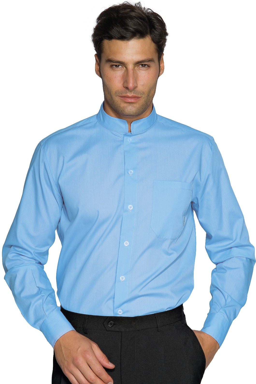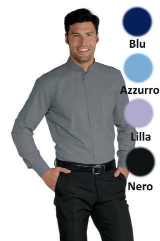Camicia con il collo alla coreana per uomo e donna hotel stuart hostess a manica lunga disponibile nei colori Bianco, Nero, Blu, Bordeaux, Vermiglio, Azzurro, Grigio, Biscotto beige, Cacao, Lilla. Ottima divisa per hotel, alberghi, conciergierie, hostess, stuarts. Brand Isacco Art. Camicia unisex Dublino M/L.