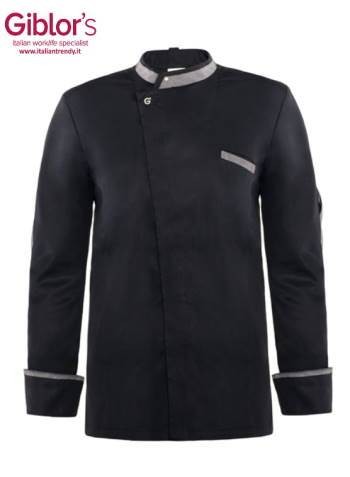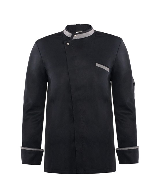Giacca da cuoco professionale di alta qualità, progettata per offrire comfort, funzionalità ed eleganza durante le lunghe ore di lavoro in cucina. è caratterizzata da una silhouette sciancrata, conferendo un tocco moderno e professionale. Il colore nero, con inserti grigi e in tessuto di jeans, dona un aspetto sofisticato e contemporaneo, mentre i dettagli come il collo alla coreana e l’abbottonatura nascosta aggiungono raffinatezza al design.
