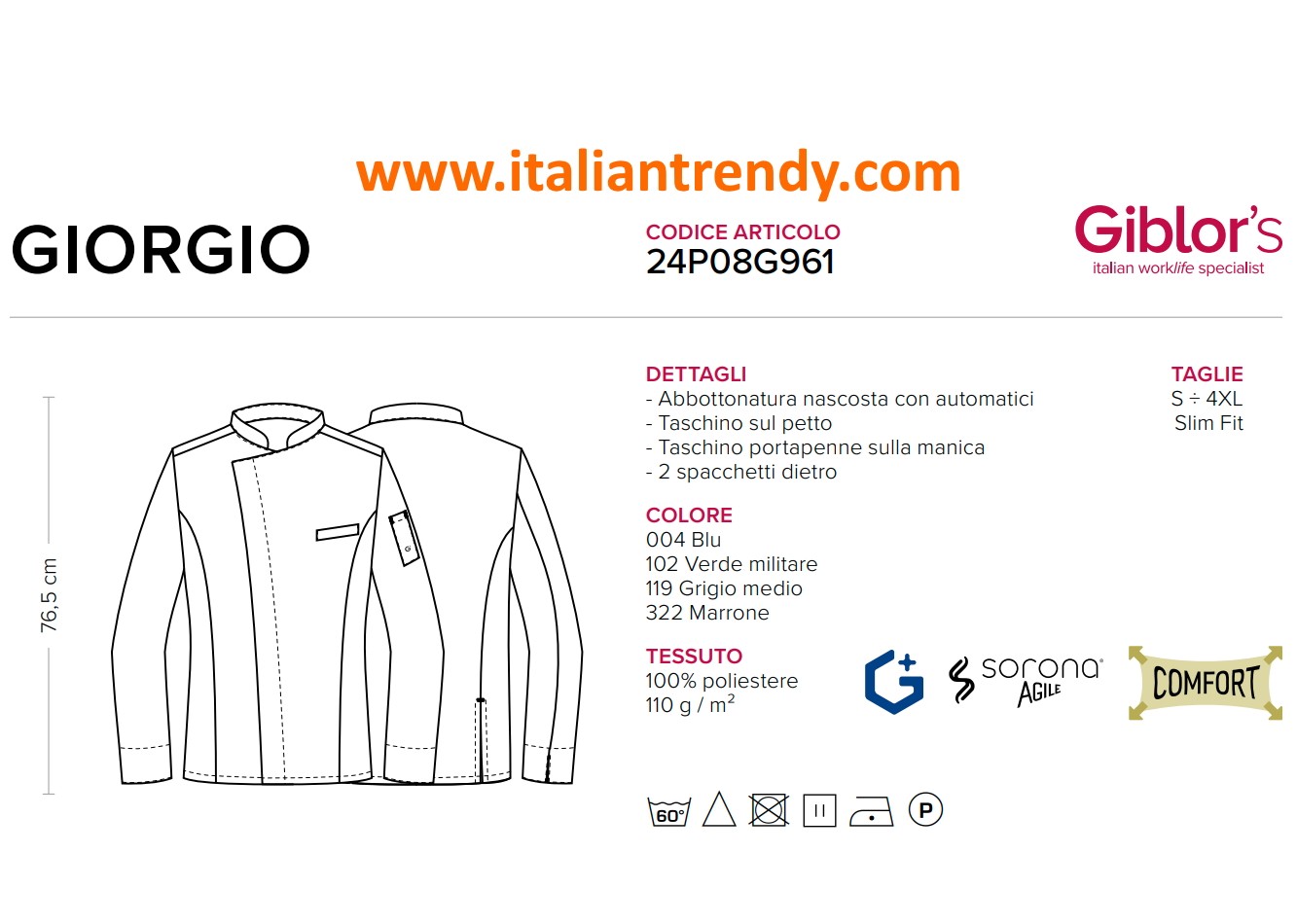 La giacca da cuoco Giorgio è un capo essenziale per ogni chef che cerca una divisa leggera e performante. Realizzata nel tessuto innovativo G-TECH PRO, questa giacca offre incredibili prestazioni in termini di comfort e funzionalità.
