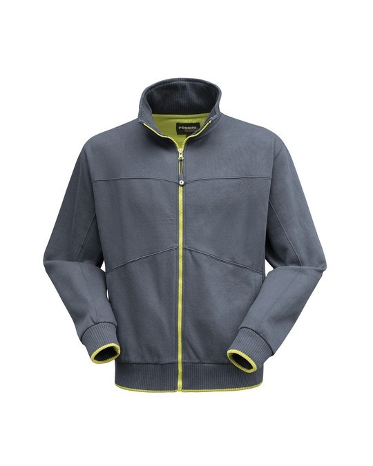 Felpa professionale a giubbino con vestibilità regolare in tinta unita. Possiede un’allacciatura centrale, con una zip in plastica in colore giallo. Sono presenti due tasche verticali interne e non applicate, poste nella parte inferiore della felpa.