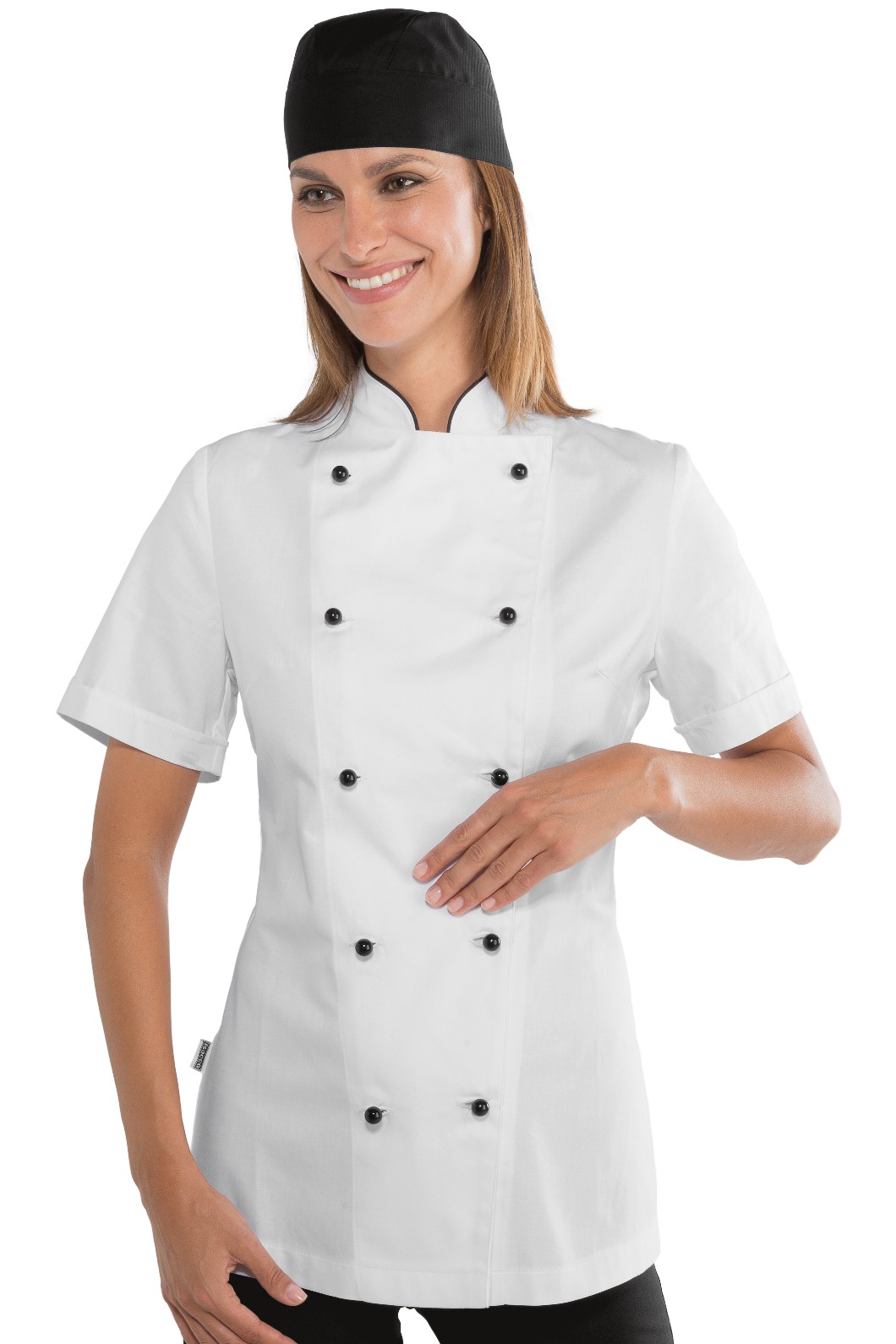 Giacca sciancrata per donna per cuoca o lady chef in 100% cotone. Casacca sagomata e in tinta unita bianca o con profili neri a contrasto. Codice: 057500-057511 Lady Chef o Granchef. Brand Isacco