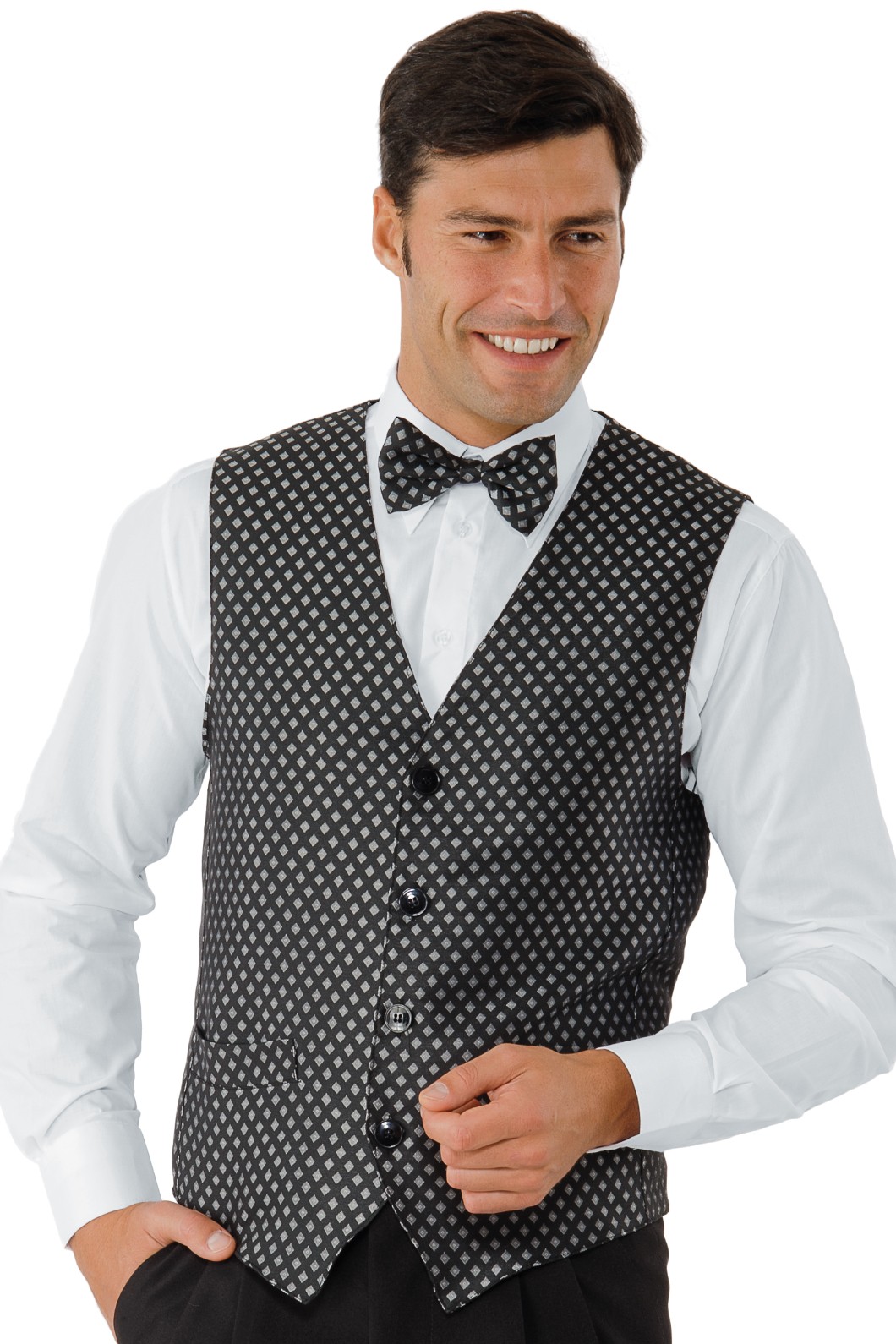 Gilet elegante uomo donna in raso con fantasia geometrica tipo cravatta particolarmente adatto per locali particolari o di lusso ma soprattutto eleganti, quindi completa le divise di Hotel ristorante hostess catering barman.