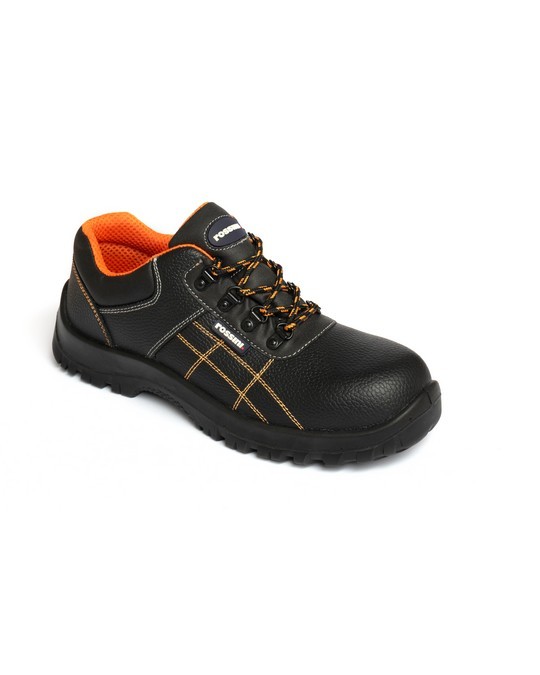 Robusta ed efficiente scarpa bassa di colore nero, per cantieri o per l’uso in officine o magazzini, rientra nei dispositivi di protezione individuale.