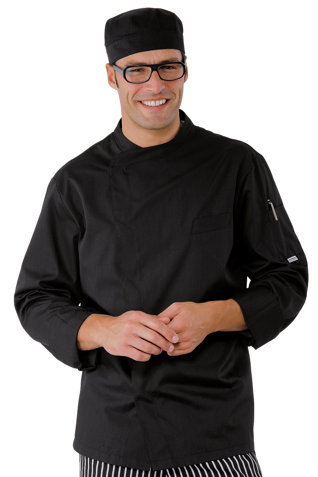 Giacca nera professionale da uomo super leggera con la schiena con retina traspirante, modello pretoria, ottima come divisa da cuoco, con bottoni nascosti automatici a pressione. Brand Isacco