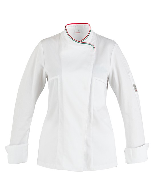 Il design sciancrato abbraccia le curve femminili, conferendo una silhouette sofisticata, mentre il collo alla francese aggiunge un tocco di classe. La chiusura con bottoni automatici nascosti unisce praticità e stile senza sforzo. Dettagli come il taschino sul petto e il porta penne sulla manica sinistra sono pensati per offrire massima praticità durante il lavoro in cucina.